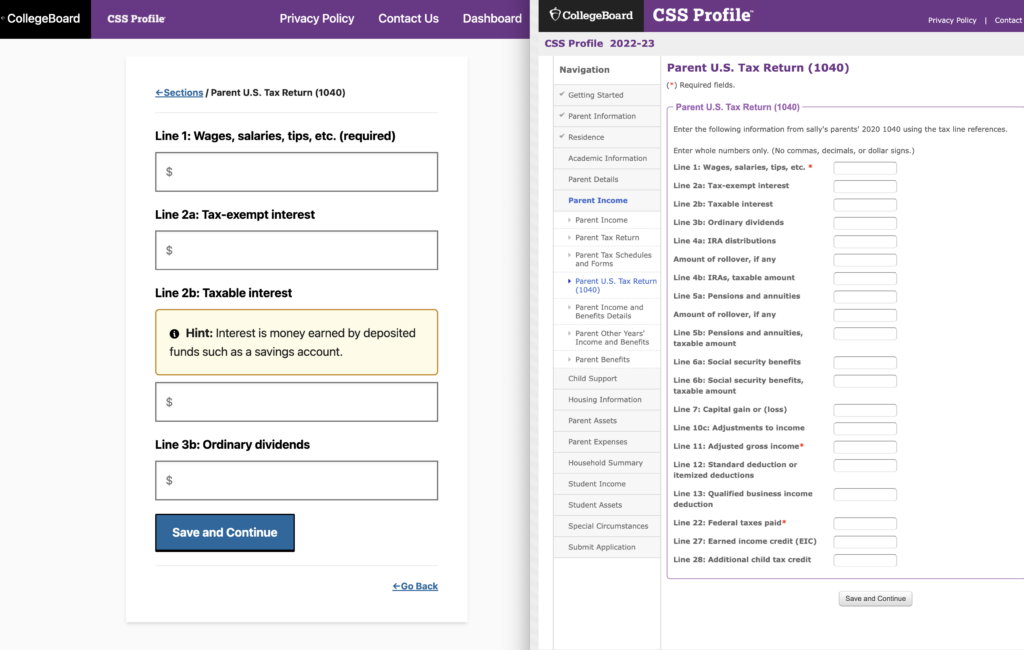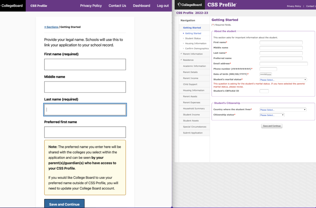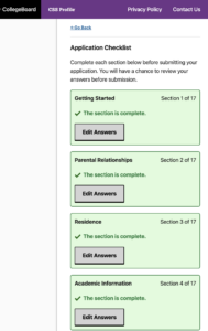 If you’ve had the pleasure of filling out the CSS profile before, you may notice this year’s version looks a little different. The questions are basically all the same, but the layout and feel as you progress through the profile is not. Instead of 10-15 questions per page, you will now only see 2-4 questions. The font is much bigger and the text color is darker as well.