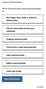 We strongly encourage you to NOT answer questions about retirement or social security because you will have to disclose your retirement account balances. Retirement assets are NOT included in the institutional need calculation, so there is no need to share it.